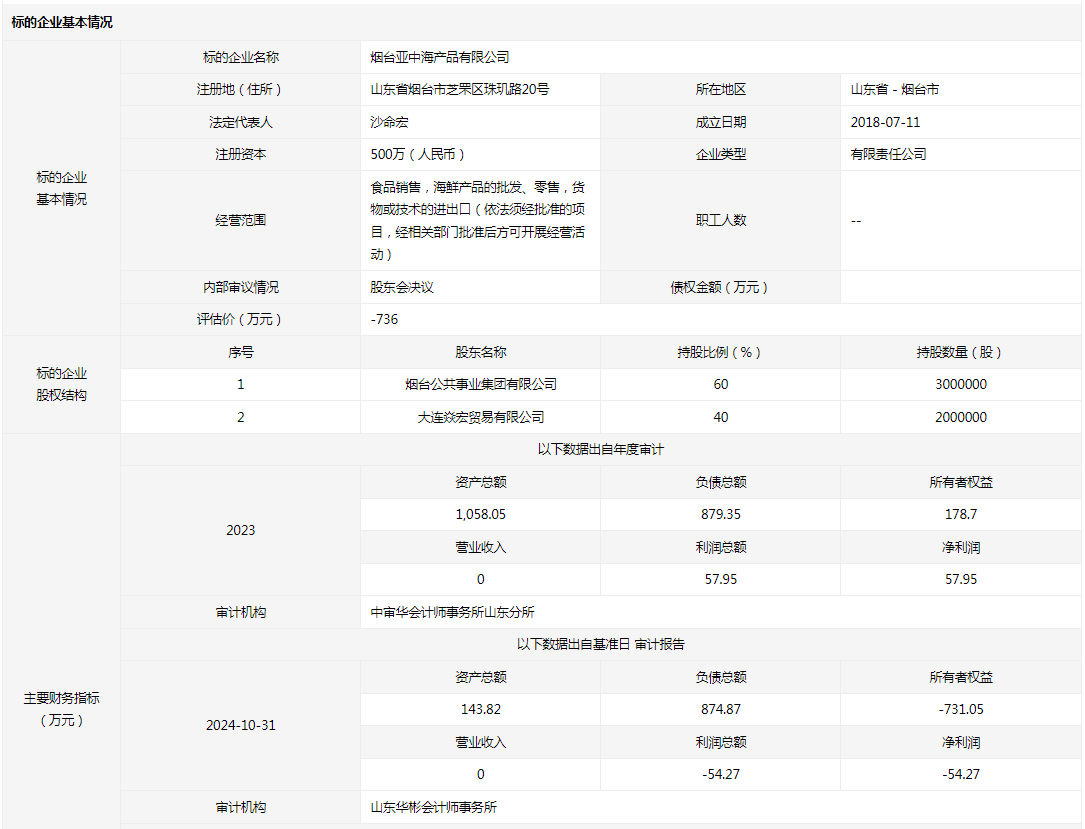 煙臺亞中海產品有限公司60%國有股權