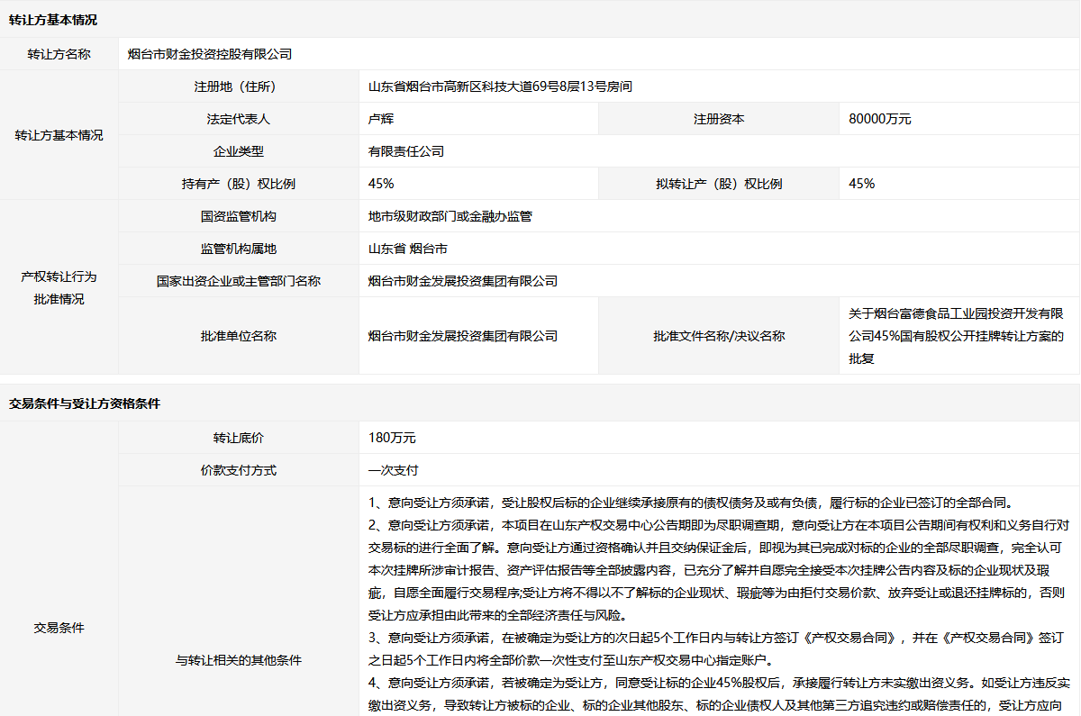 煙臺(tái)富德食品工業(yè)園投資開發(fā)有限公司45%股權(quán)