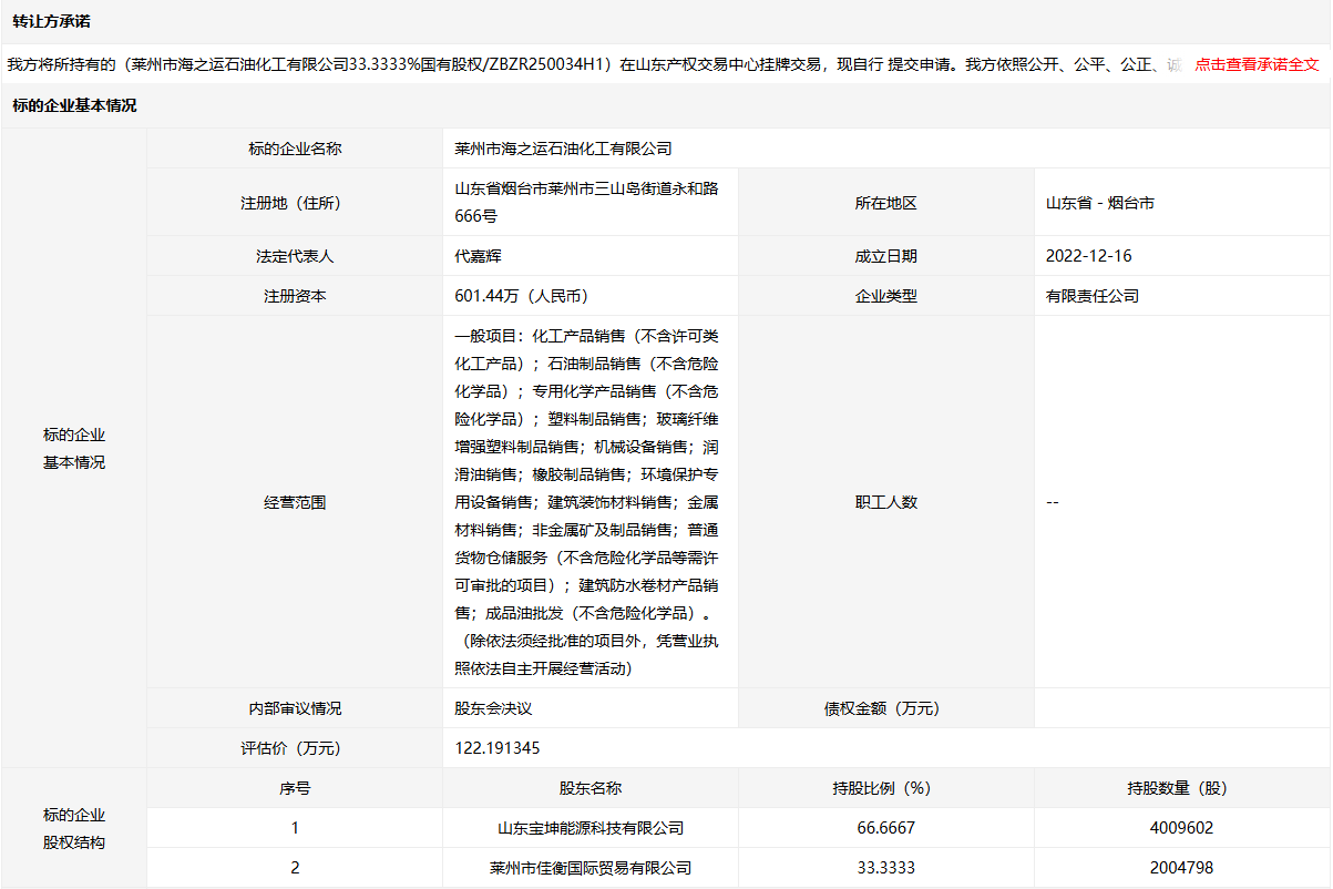 萊州市海之運石油化工有限公司33.3333%國有股權