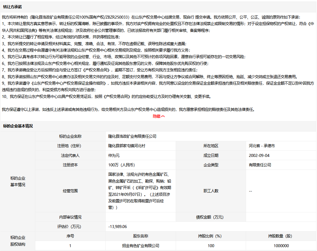 隆化縣浩政礦業(yè)有限責任公司100%國有產(chǎn)權(quán)