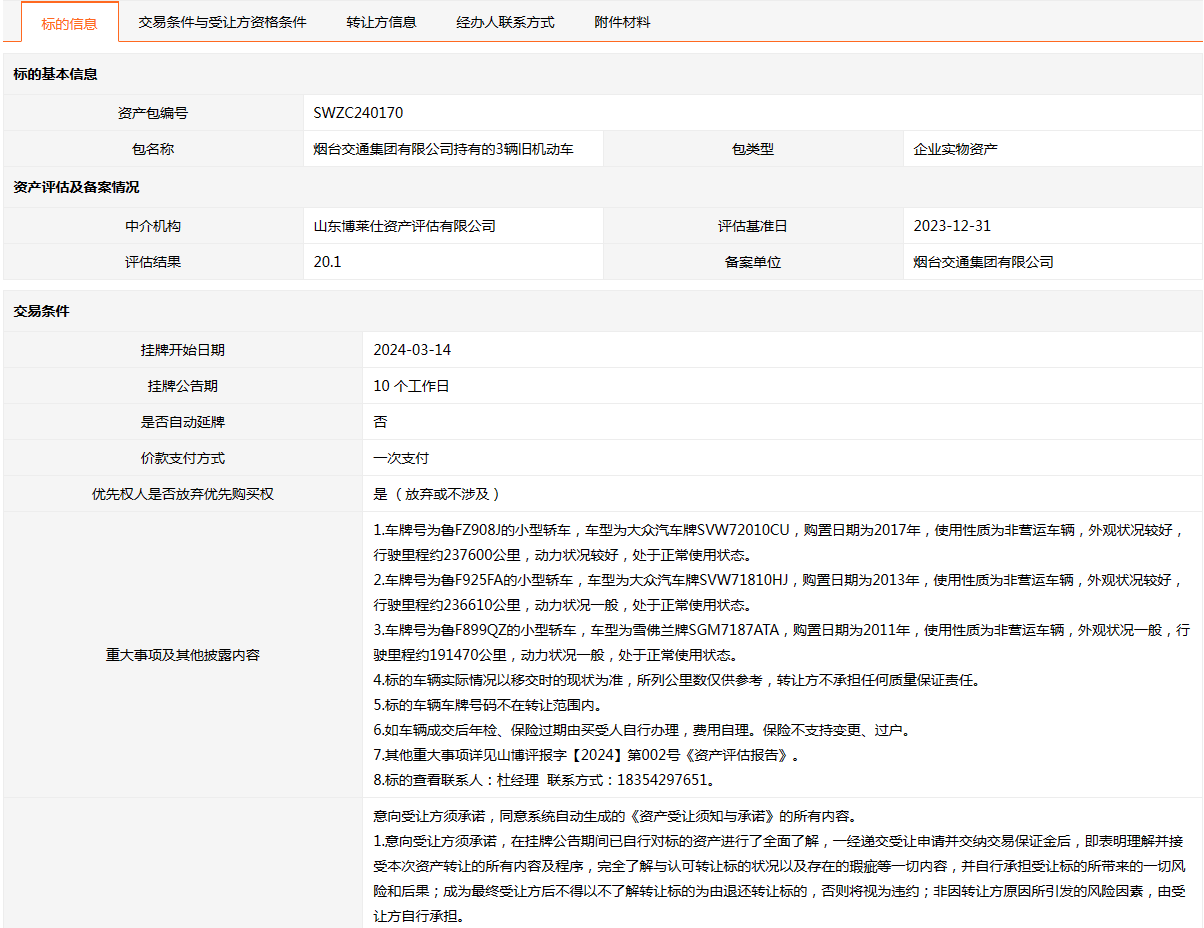 煙臺(tái)交通集團(tuán)有限公司持有的3輛舊機(jī)動(dòng)車