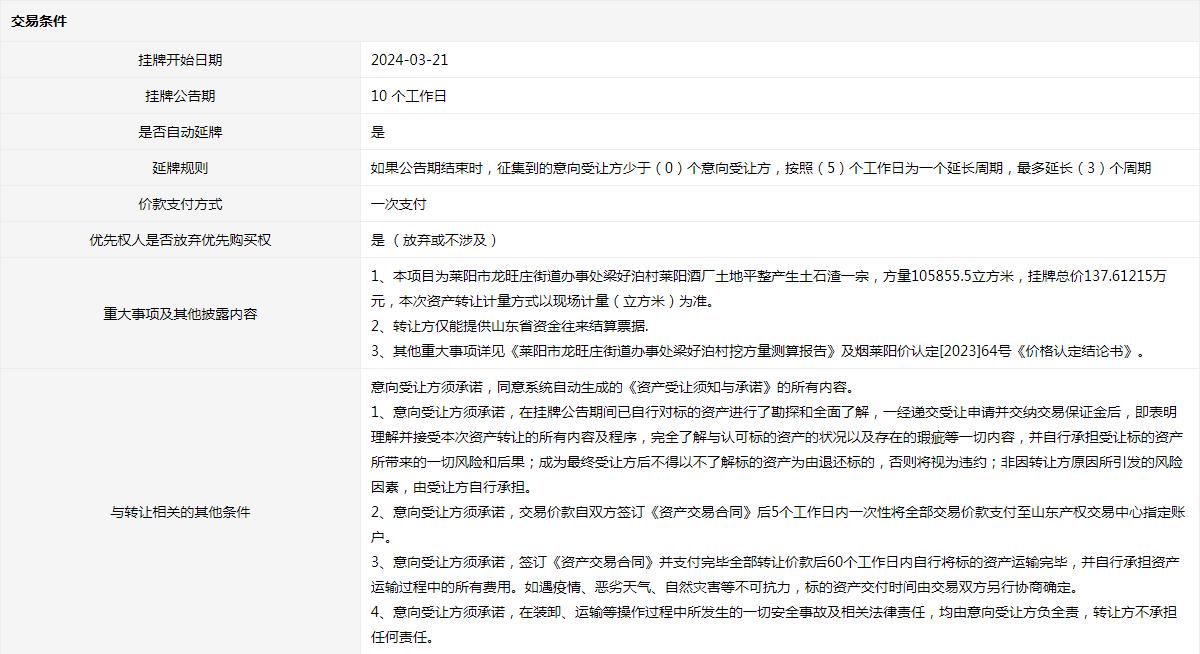 萊陽(yáng)市龍旺莊街道辦事處梁好泊村萊陽(yáng)酒廠土地平整產(chǎn)生土石渣一宗
