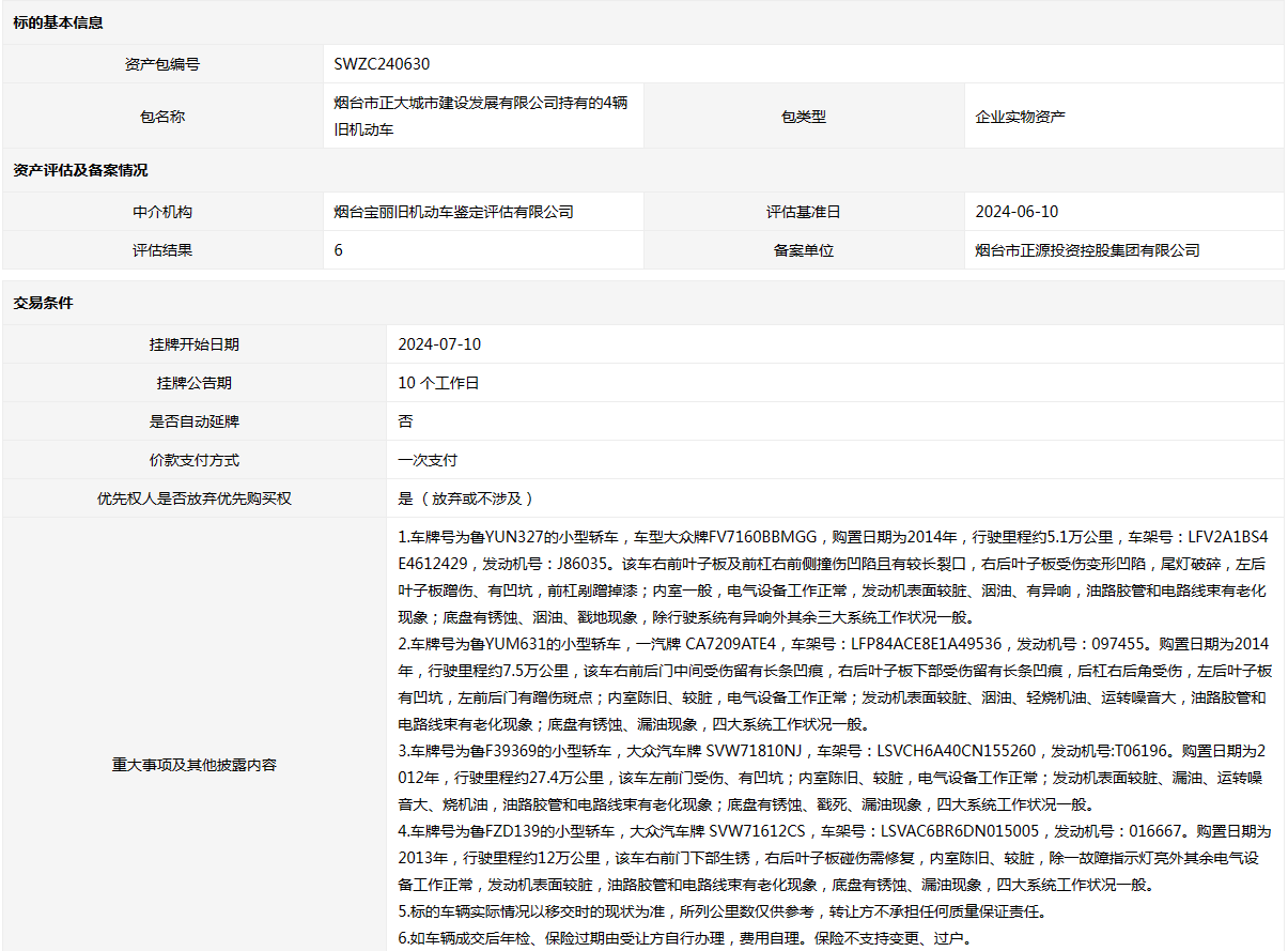 煙臺市正大城市建設(shè)發(fā)展有限公司持有的4輛舊機(jī)動(dòng)車