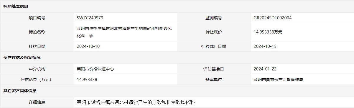 萊陽(yáng)市譚格莊鎮(zhèn)東河北村清淤產(chǎn)生的原砂和機(jī)制砂風(fēng)化料一宗
