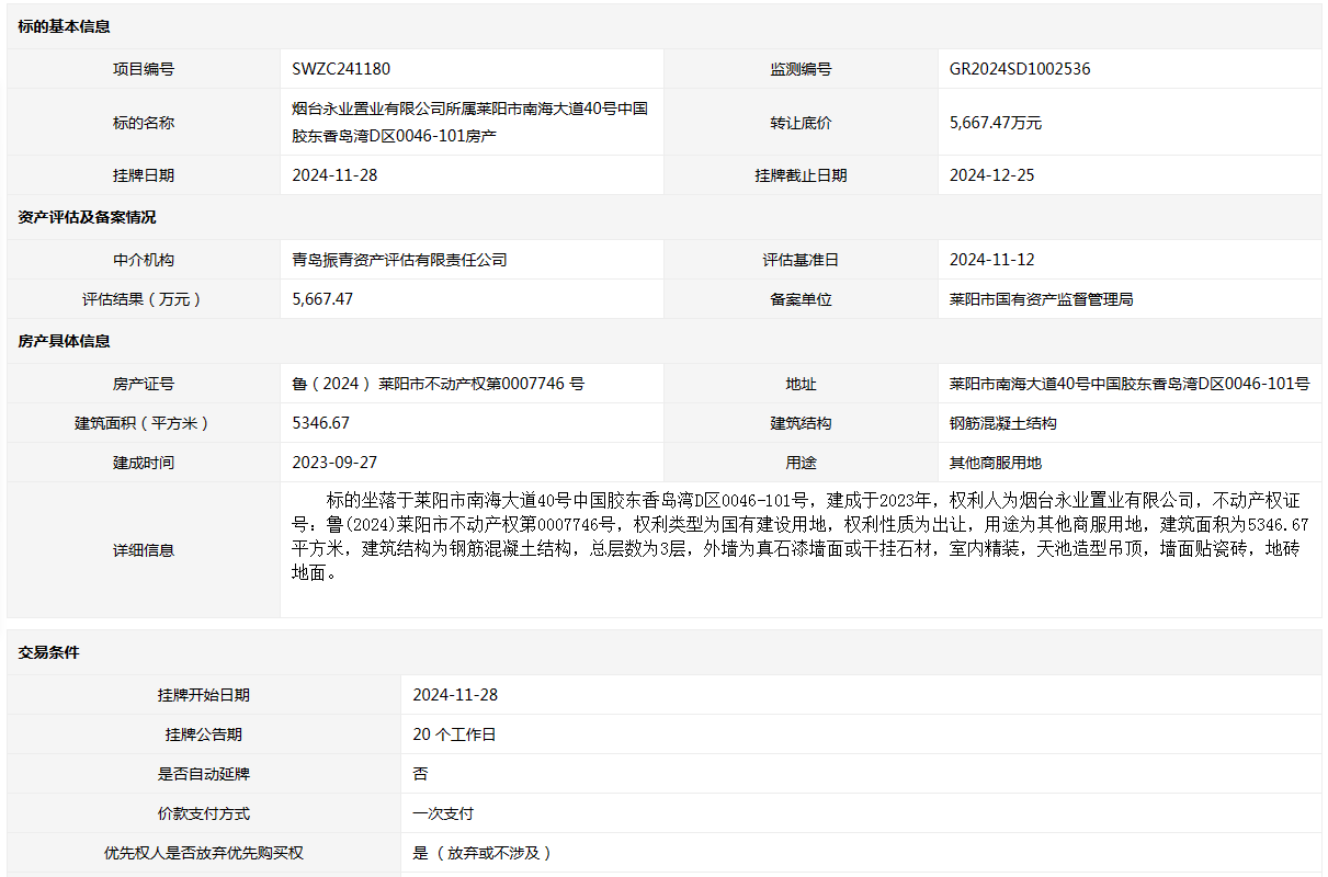 煙臺永業(yè)置業(yè)有限公司所屬萊陽市南海大道40號中國膠東香島灣D區(qū)0046-101房產