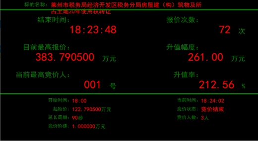 近日,萊州市稅務(wù)局經(jīng)濟(jì)開(kāi)發(fā)區(qū)稅務(wù)分局所屬房屋建筑物及所占土地20年使用權(quán)轉(zhuǎn)讓項(xiàng)目在煙臺(tái)產(chǎn)權(quán)掛牌并有多個(gè)意向受讓方報(bào)名,最終,經(jīng)過(guò)72輪激烈報(bào)價(jià),項(xiàng)目較掛牌底價(jià)122萬(wàn)元,增值261萬(wàn)元,增值率高達(dá)212.56%,不但保證了疫情期間國(guó)有產(chǎn)權(quán)業(yè)務(wù)的正常開(kāi)展,而且?guī)椭a(chǎn)權(quán)持有人實(shí)現(xiàn)了價(jià)值最大化。